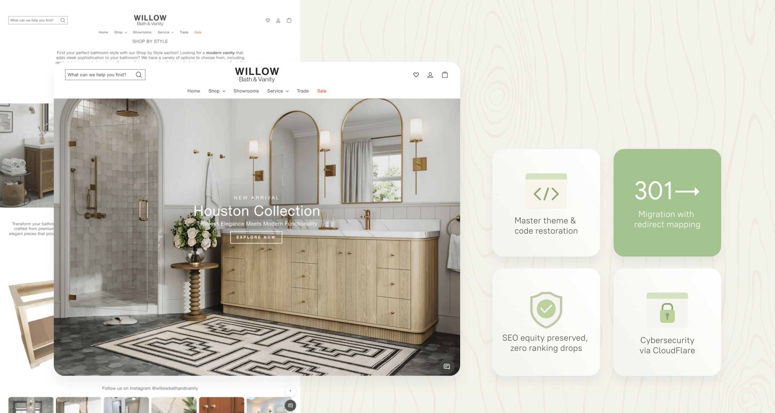 Інфраструктурна міграція із збереженням SEO-ваги: реалізовано переїзд на основний домен із налаштуванням складної системи 301-редиректів (наприклад, з /shop/ на /collections/shop). Карту редиректів розроблено у тісній взаємодії з SEO-командою: кожен старий URL зіставлявся семантично, а не механічно, — товар до товару, товар до категорії при видаленні, застарілі URL до релевантних розділів. Це зберегло SEO-вагу сайту та очистило URL від технічного сміття.