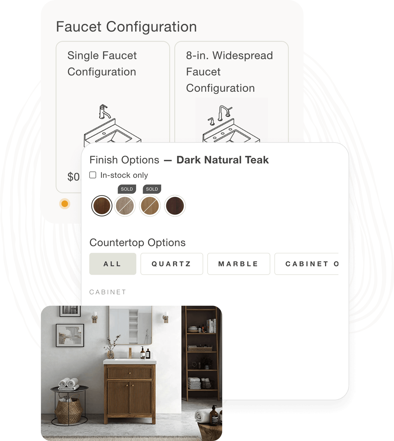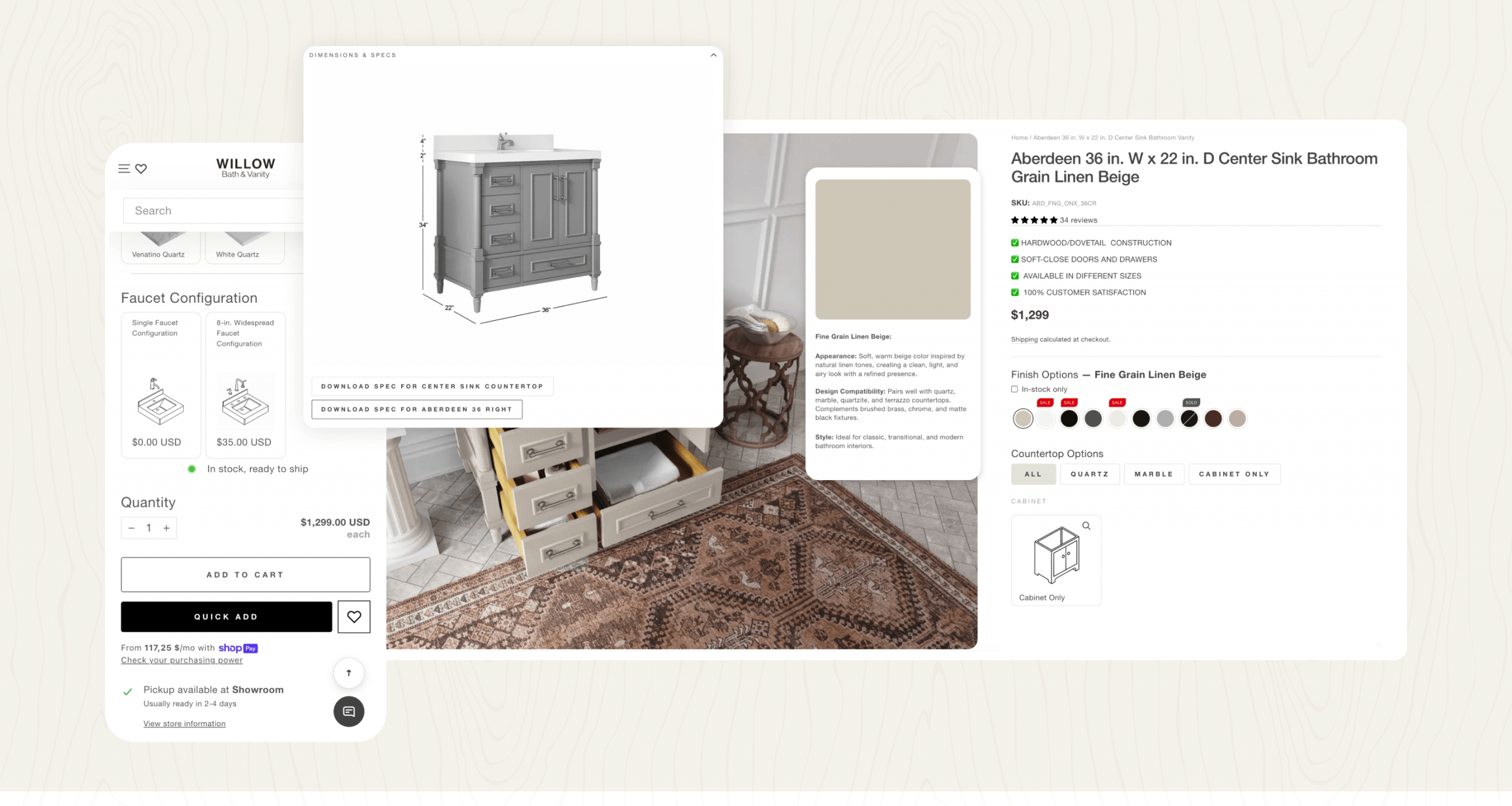 Стандартний ліміт Shopify (до 100 варіацій на продукт) не відповідав потребам WBV, де кожен товар має десятки взаємозалежних конфігурацій. Щоб обійти це обмеження, виведення характеристик переведено на метафілди. Це дозволило розділити товари за кольорами без втрати SEO-зв’язків та забезпечити клієнту вибір лише сумісних компонентів. Кастомні блоки “Countertop Options” та “Handle Configuration” дають змогу бачити лише релевантні комбінації.