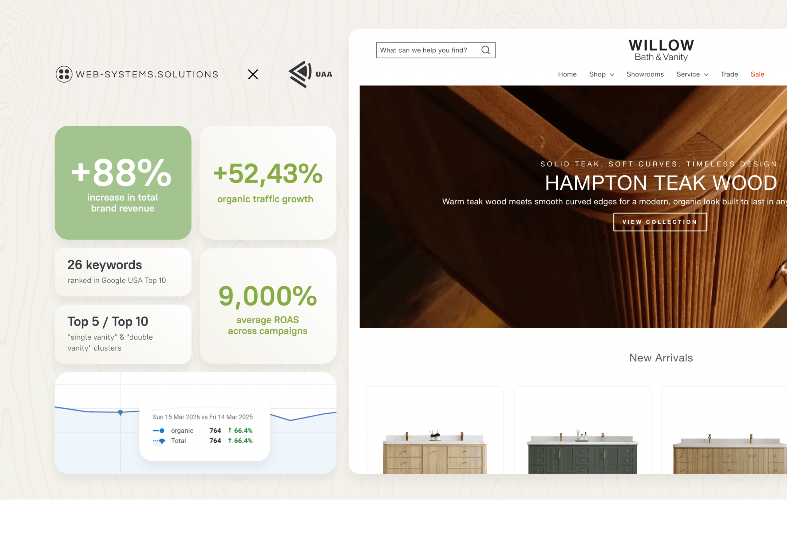Поєднання 10-річного досвіду Shopify-розробки Web-Systems Solutions та глибокої SEO-експертизи UAATEAM дозволило перетворити проблемний сайт на високотехнологічний бізнес-актив. Переїзд пройшов без просадки позицій, а після переіндексації сайт показав стабільне зростання.